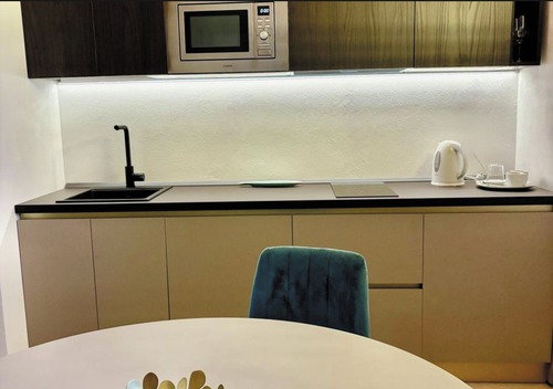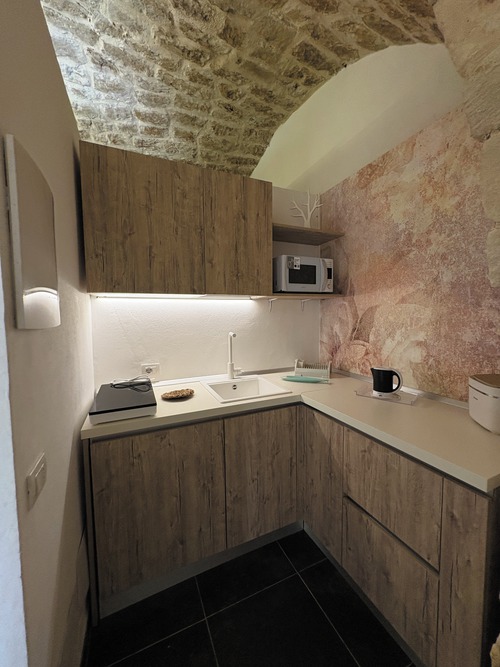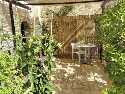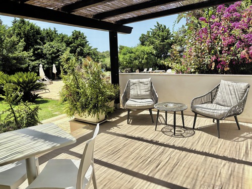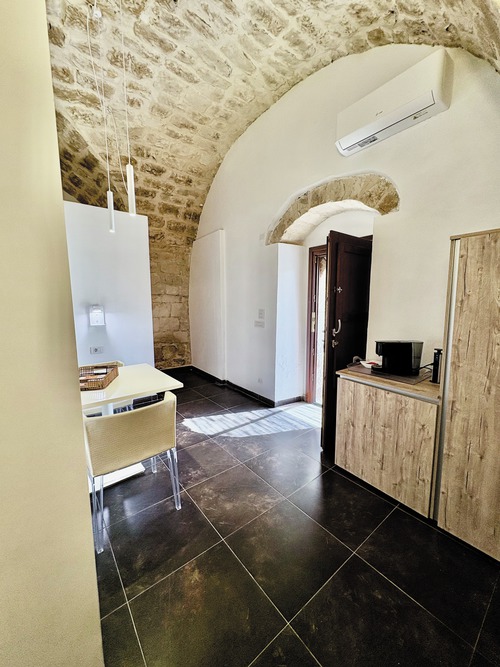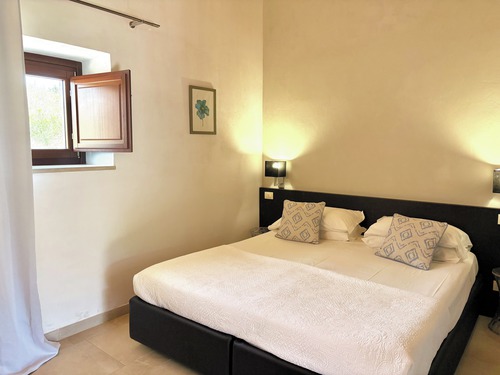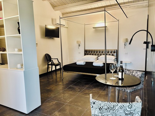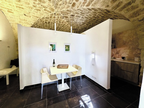 9 suites confortables avec réfrigérateur, micro-ondes, bouilloire, cafetière, grille-pain et plaques de cuisson. Sol carrelé. Choix entre le studio standard avec terrasse privée, avec ou sans vue sur la piscine (22 m², kitchenette, max. 2 personnes) ou un appartement deluxe avec patio privé et vue sur la cour de l'ancienne masseria (35 m², kitchenette, max. 2 personnes). Pour les familles, un appartement (53 m², max. 3 personnes, mezzanine avec lit double, kitchenette, lit d'appoint (au rez-de-chaussée) à p.de € 34/nuit).