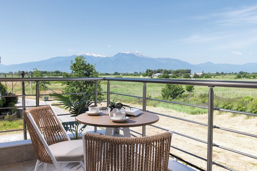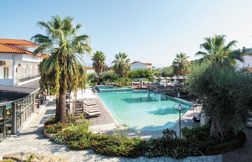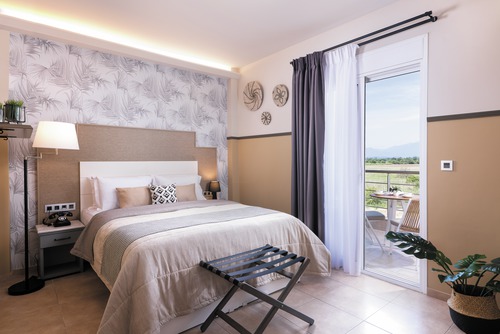 de verschillende gebouwen situeren zich rond het zwembad, het zorgt voor een instant vakantiegevoel. Voor de inrichting van de kamers werd gekozen voor heldere kleuren, wit en lichtgrijs, in combinatie met blauwe accenten. Het thema Griekse zomer wordt hier heel mooi weergegeven. Houten voer. Balkon of terras. Koelkastje. Standaardkamers (19-21 m², max. 2 personen), superior kamers (28 m², max. 3 volwassenen of 2 volwassenen en 2 kinderen), executive kamers (20-25 m², max. 2 personen, mix van klassiek en modern), de 3 types met zicht op de tuin of het zwembad. Familiesuites met zicht op de tuin (34 m², aparte slaapkamer, max. 4 volwassenen of 2 volwassenen en 2 kinderen, geen balkon of terras). Extra bed 3de en 4de volwassene: 30% korting.